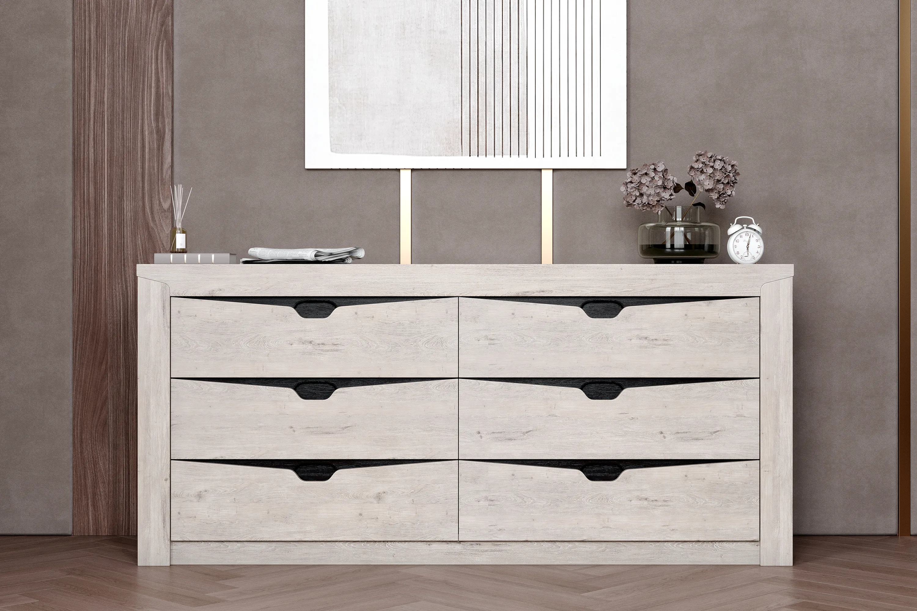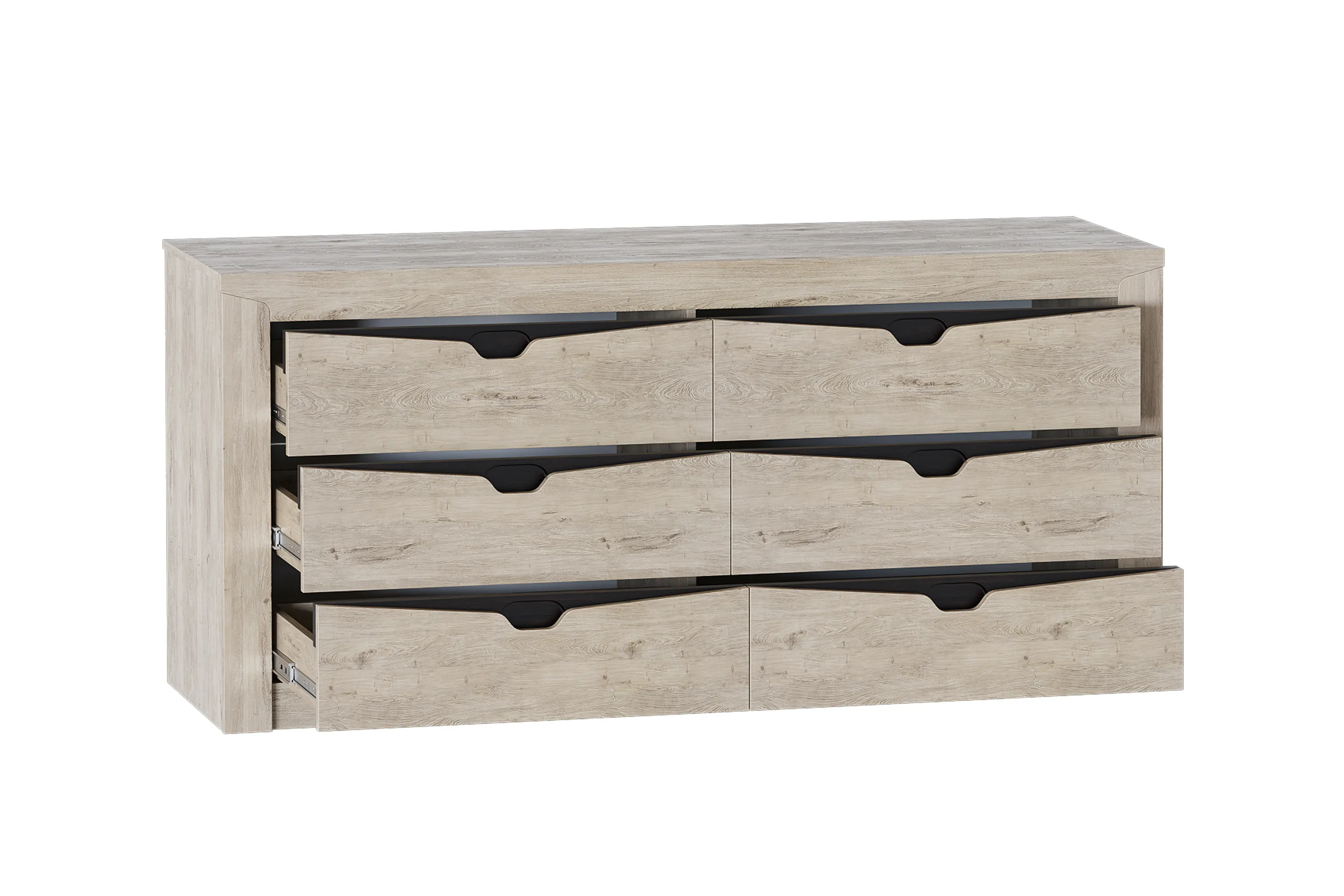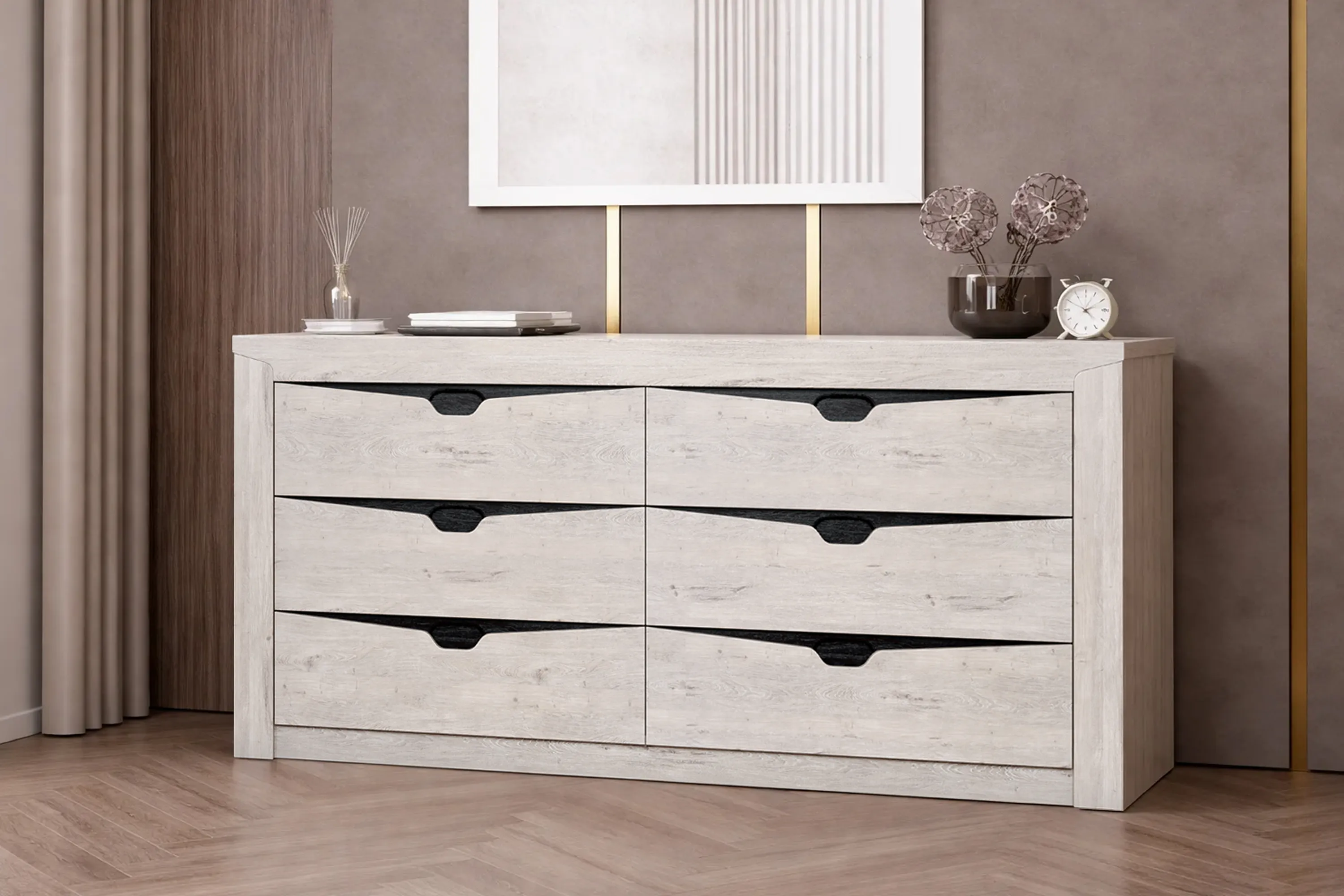 Комод "Соренто" идеально подойдёт для спальни и станет прекрасным дополнением к вашему интерьеру. Шесть вместительных выдвижных ящиков на шариковых направляющих позволяют хранить множество вещей, таких как одежда, белье, аксессуары. В фасадах ящиков имеются декоративные вырезы, выполняющие функцию ручек в цвете кофе структурный матовый.